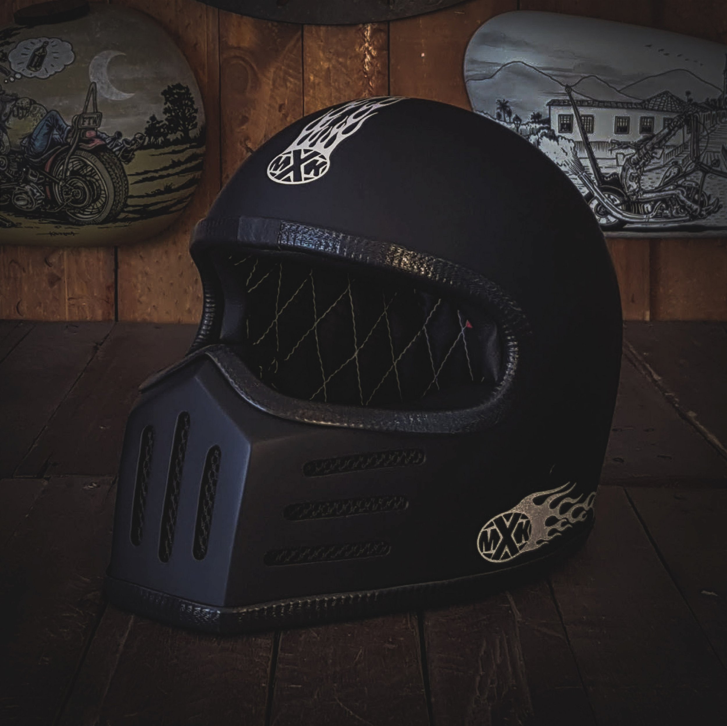 Os capacetes MXK Helmets são feitos artesanalmente, com casco em fibra, pintura automotiva, forro rebaixado (sem isopor) e um excelente acabamento.