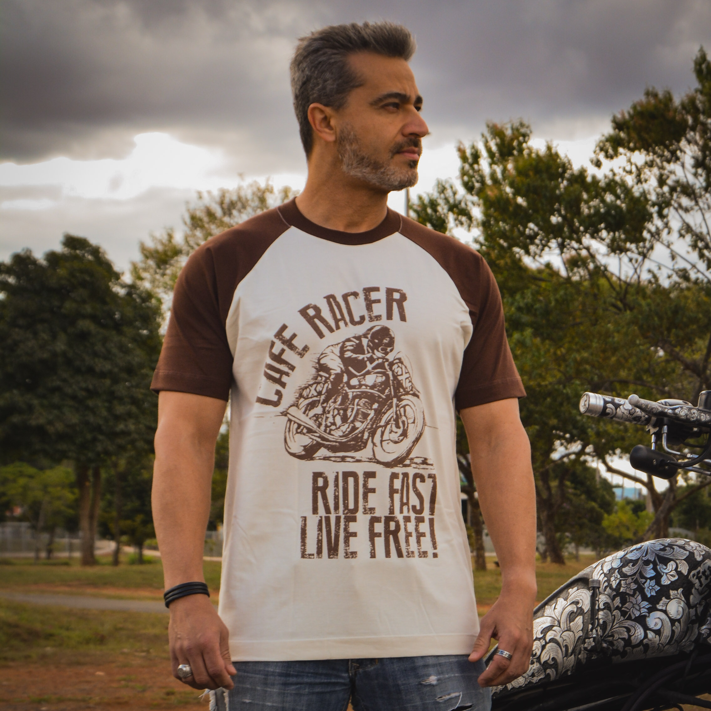 Criada a partir de um desenho de uma cafe racer feito com o bom e velho lápis e papel, Esta estampa  representa o verdadeiro espírto dos pilotos Londrinos dos anos 50 disputando corrida entre os cafes da cidade!